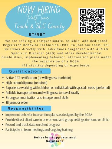 We are currently looking for part-time Behavior Technicians (BTs) and Registered Behavior Technicians (RBTs) to join our growing team. We’d love to hear from you!